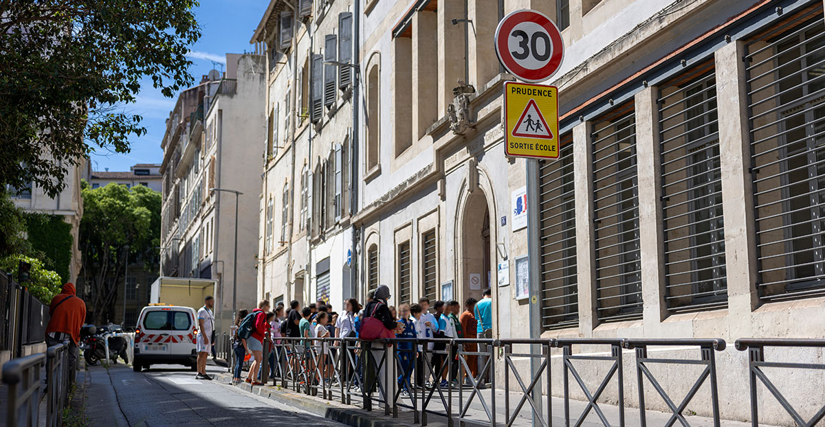 Limitation à 30 km/h devant les écoles, traversées piétonnes accompagnées, piétonnisation des abords de l'établissement en « rues des enfants », plan de mise en sécurité... La Ville de Marseille met en place une multitude de dispositifs, non seulement au sein mais également aux abords de ses écoles, pour améliorer le bien-être et la sécurité de toutes les petites Marseillaises et de tous les petits Marseillais.
