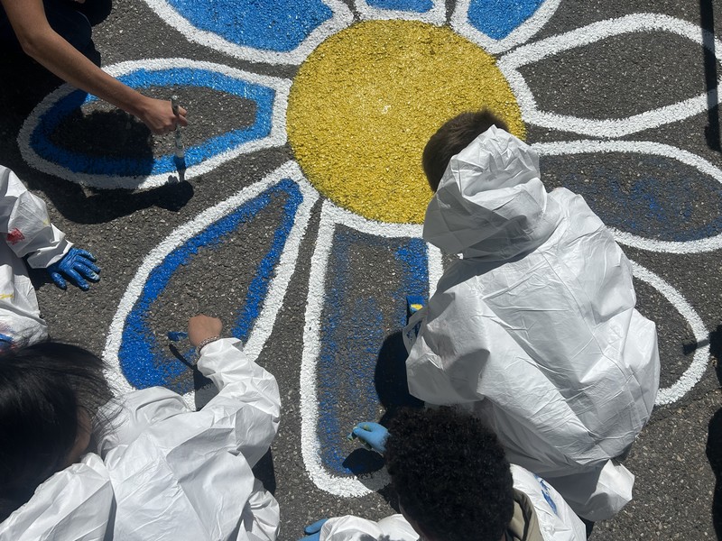 Les enfants, équipés d’une blouse et de pinceaux, ont participé à la réalisation des fleurs jaunes et de sardines rouges sur la place Sébastopol, avec l’aide de l’équipe en charge des aménagements transitoires.