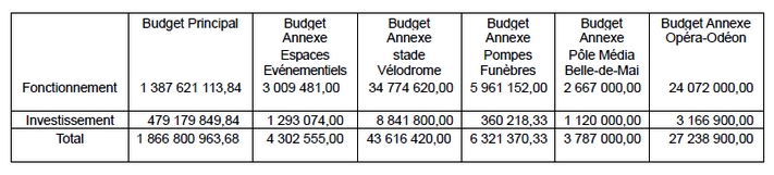 Le budget primitif de la ville de Marseille comporte un budget principal et cinq budgets annexes, équilibrés en dépenses et recettes.
