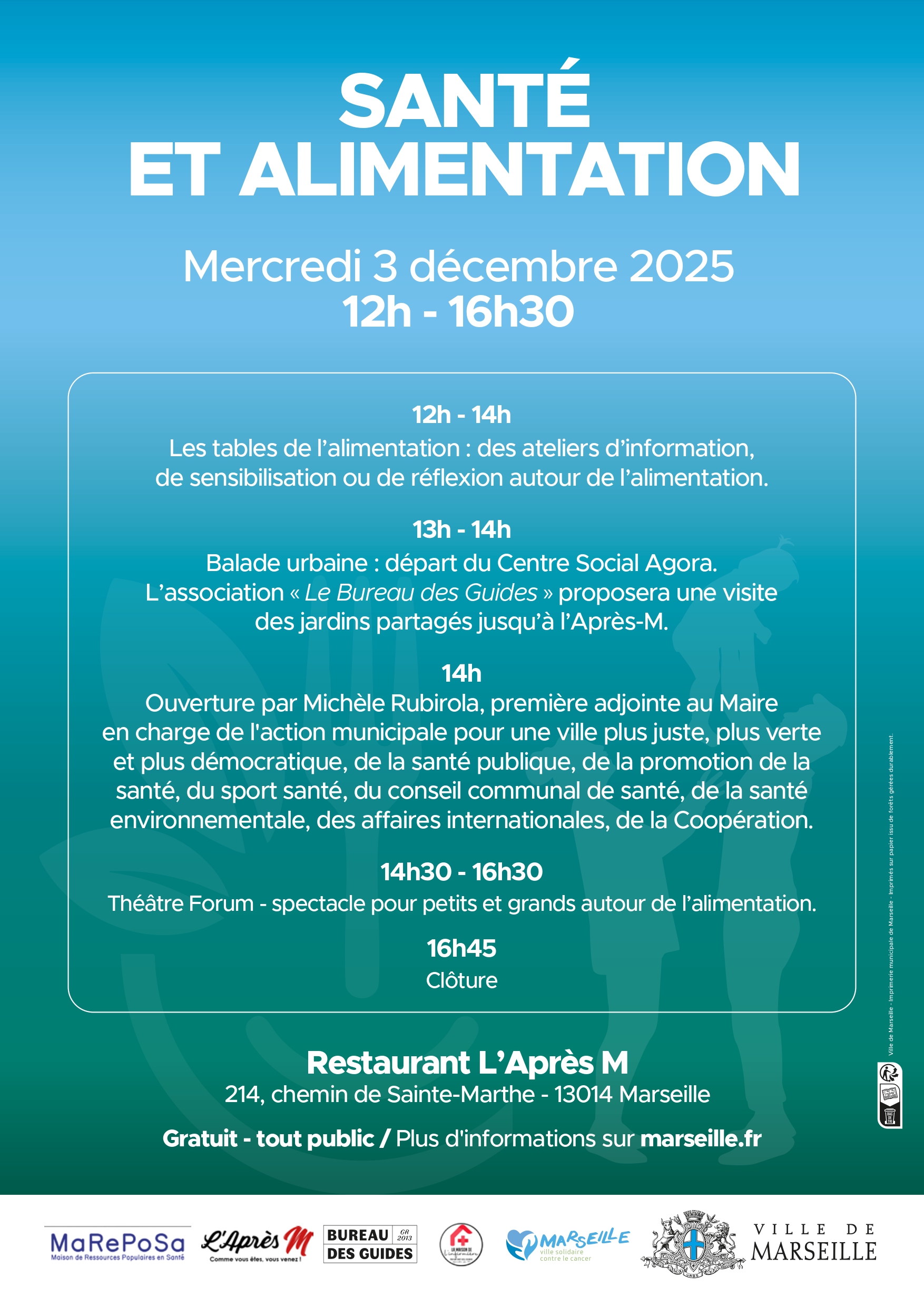 Le mercredi 3 décembre 2025, de 12h à 16h30 au restaurant L’Après M (14e), la Ville de Marseille vous invite à une après-midi reliant alimentation et santé.