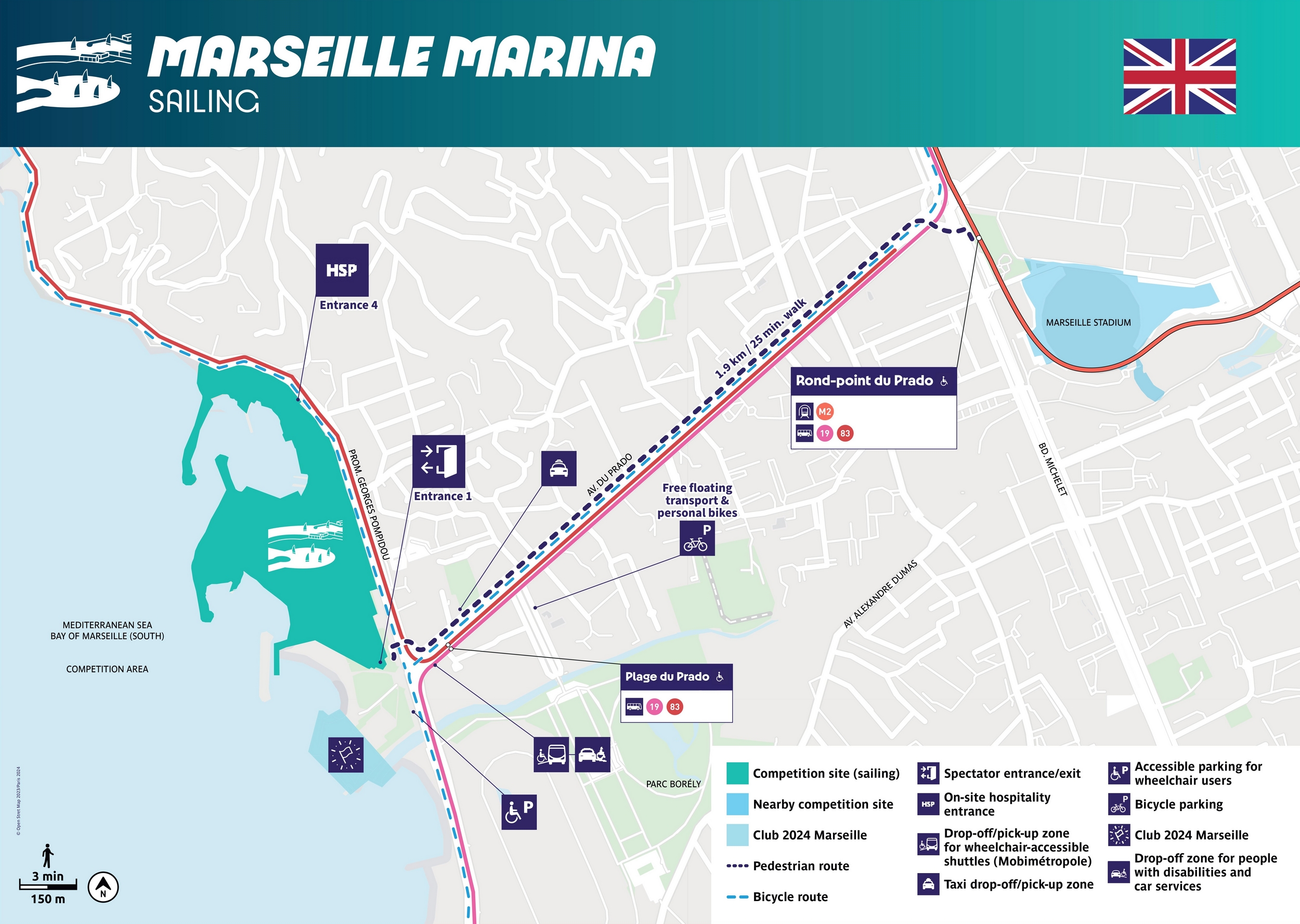 - MARINA and CLUB 2024: a Mobimétropole/Taxi-private drop off/pick up zone is located beside the Rond-Point du David roundabout on Avenue du Prado near the Plage du Prado bus stop, in the direction of the Marseille Stadium.