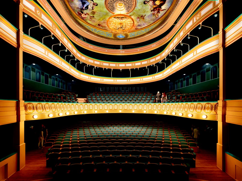 - restauration patrimoniale : salle de spectacle refaite à l’identique (nouveaux planchers, fauteuils et balcons, toiture), toiles peintes de scène, reconstitution des décors des balcons supérieurs, réhabilitation des façades ;