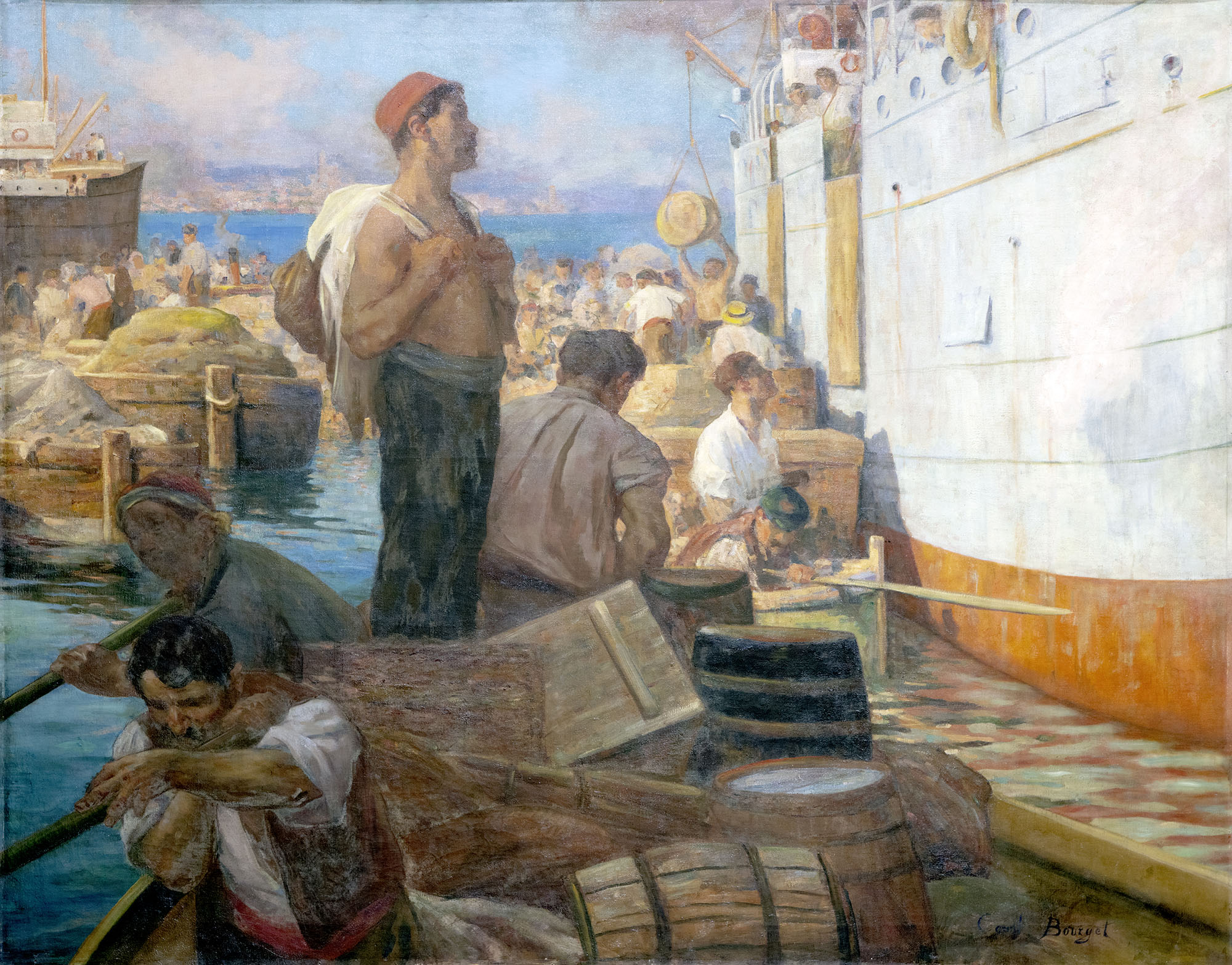 Camille Bourget, Déchargement d’un cargo, vers 1900, huile sur toile, Marseille, CCI métropolitaine Aix-Marseille-Provence (CCIAMP) Marseille, CCI métropolitaine Aix-Marseille-Provence (CCIAMP) © La Collection