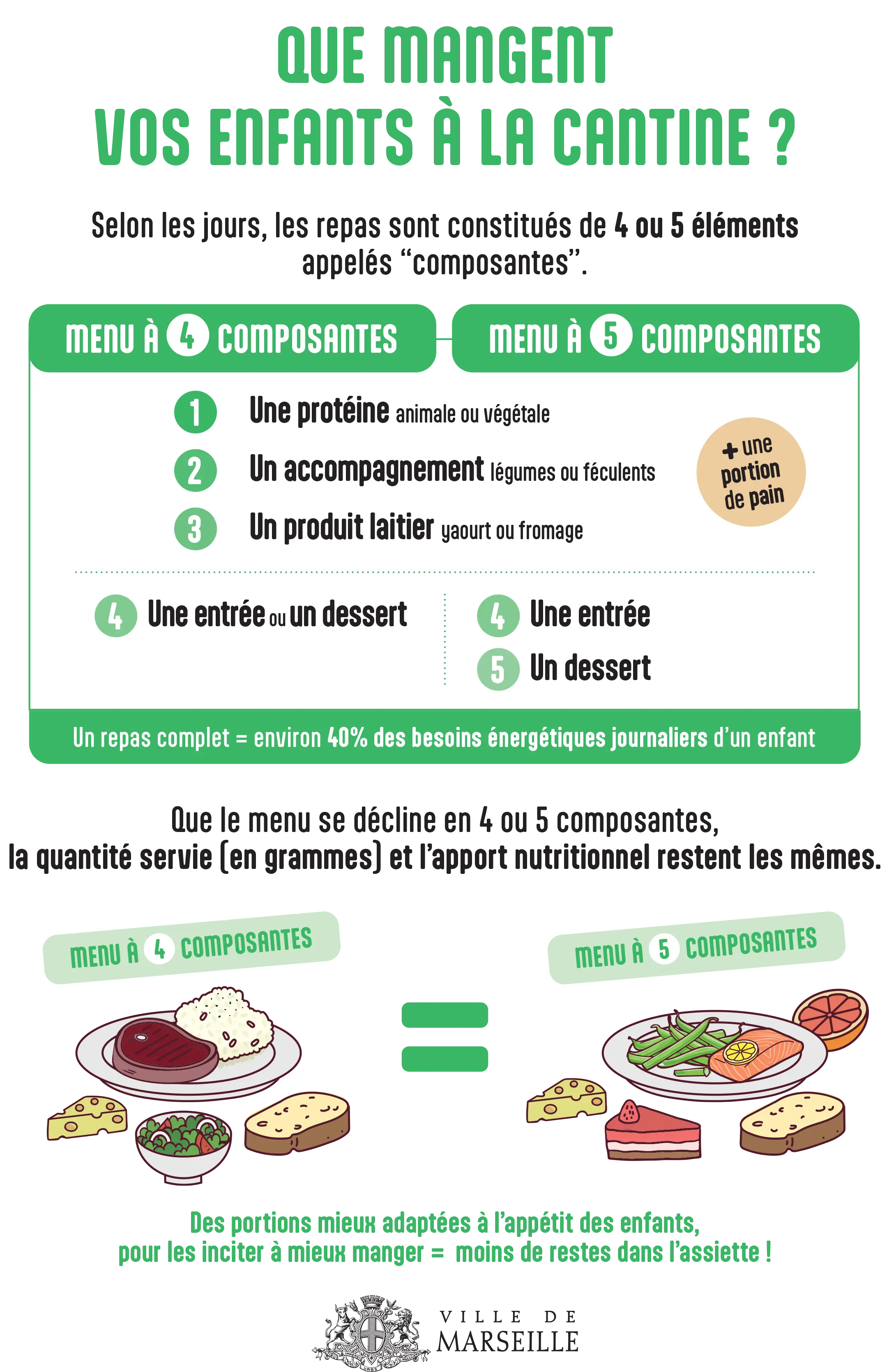 Chaque jour, la Ville de Marseille sert 55 000 repas dans les 320 restaurants scolaires, ce qui équivaut à 7,5 millions de repas consommés chaque année.