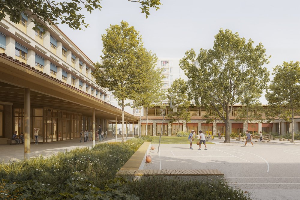 - des espaces communs, dont des salles de restauration, des cours de récréation, un parvis commun, des espaces d’accueil et une salle des maîtres.