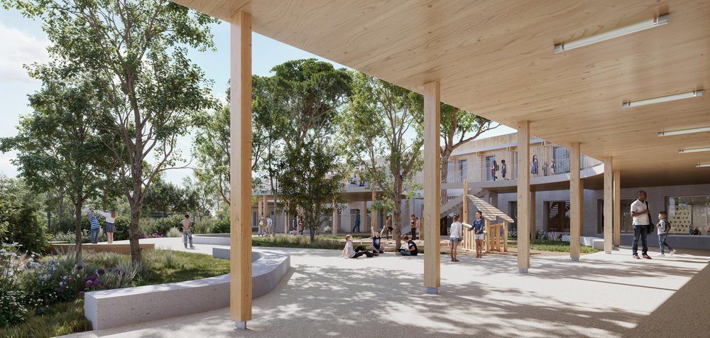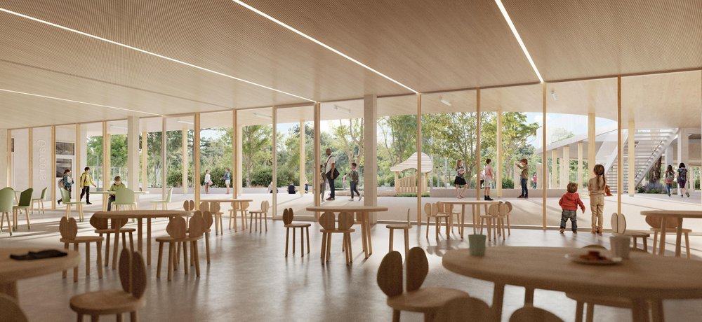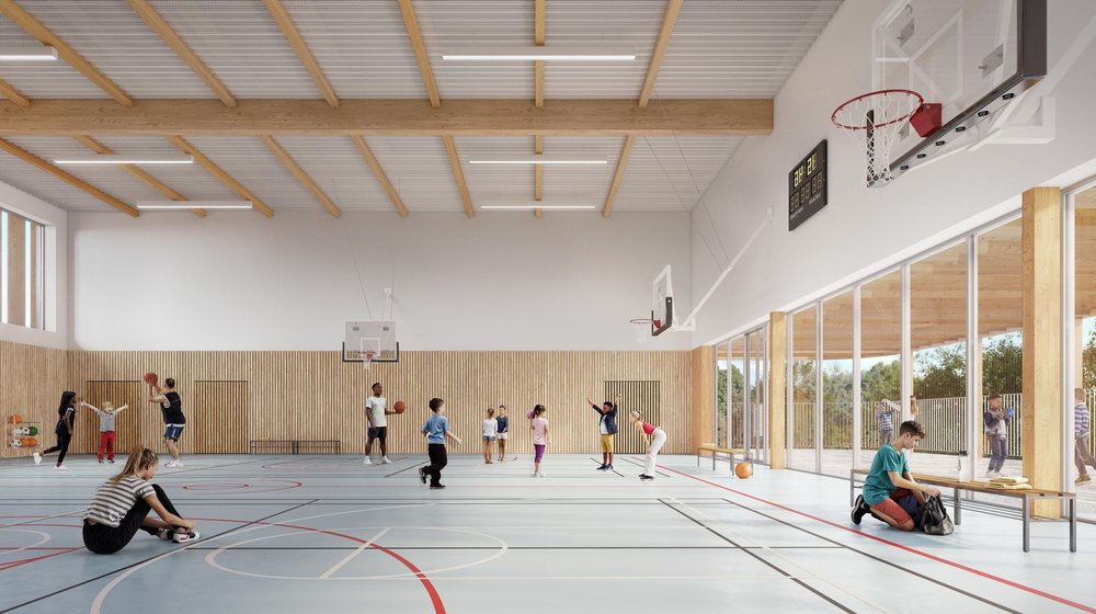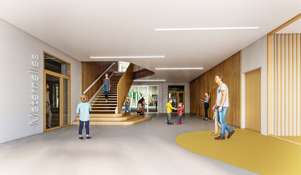 - des espaces communs, dont des salles de restauration, des cours de récréation, un parvis commun, des espaces d’accueil et une salle des maîtres.