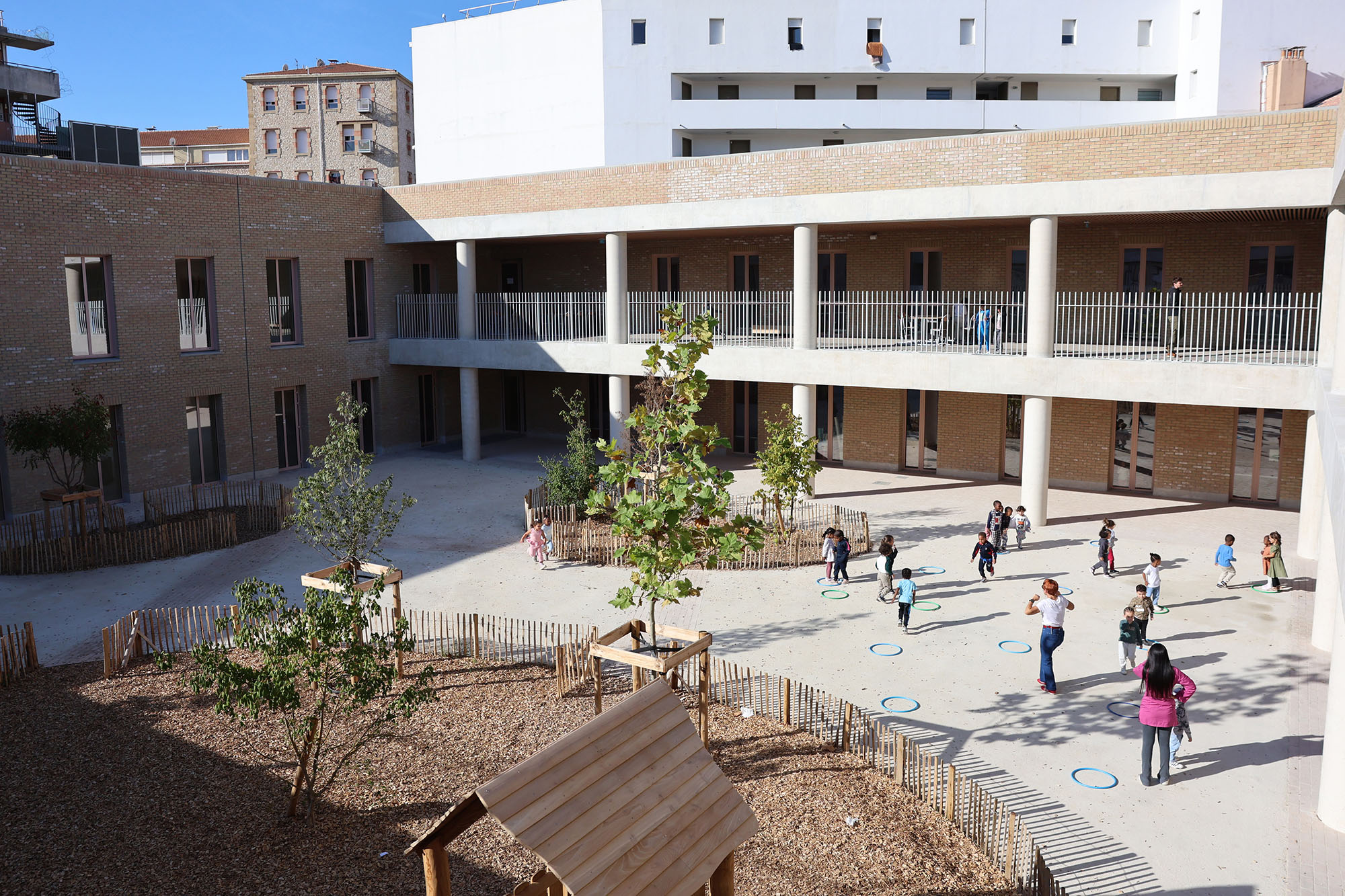 - s’inscrit dans le cadre du projet urbain Quartiers Libres Saint-Charles Belle de Mai, avec un large parvis qui permet de créer une liaison piétonne entre l’entrée principale de l’école et un nouveau parc urbain qui constitue le poumon vert du quartier.