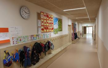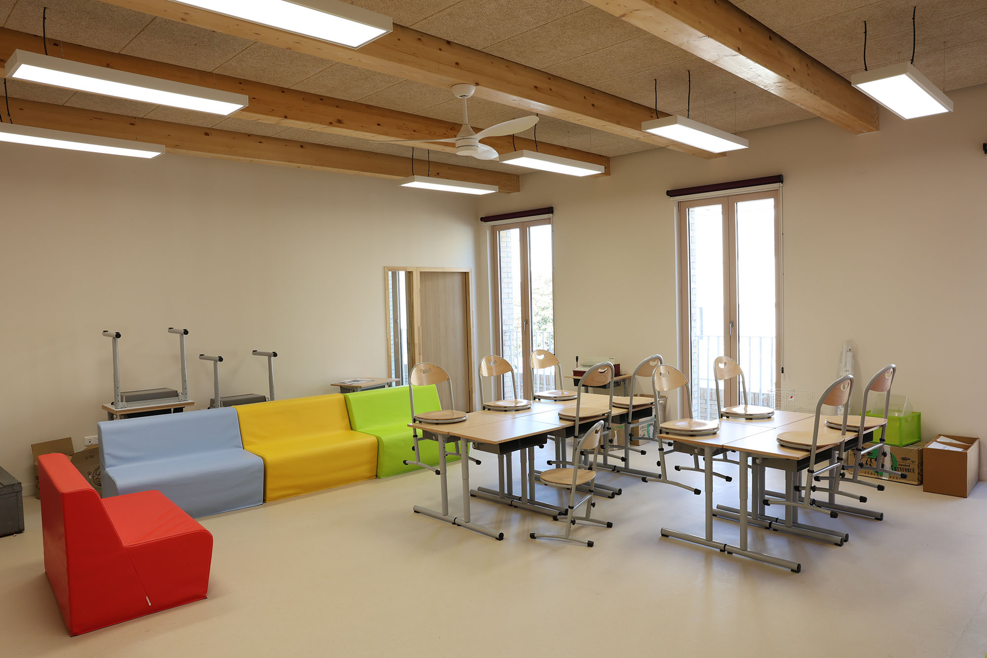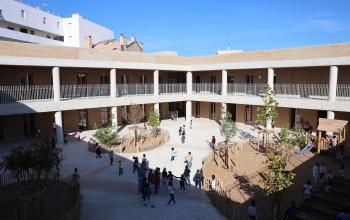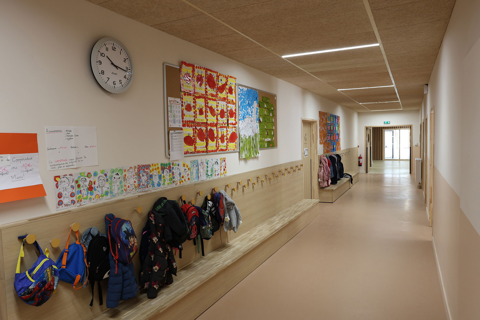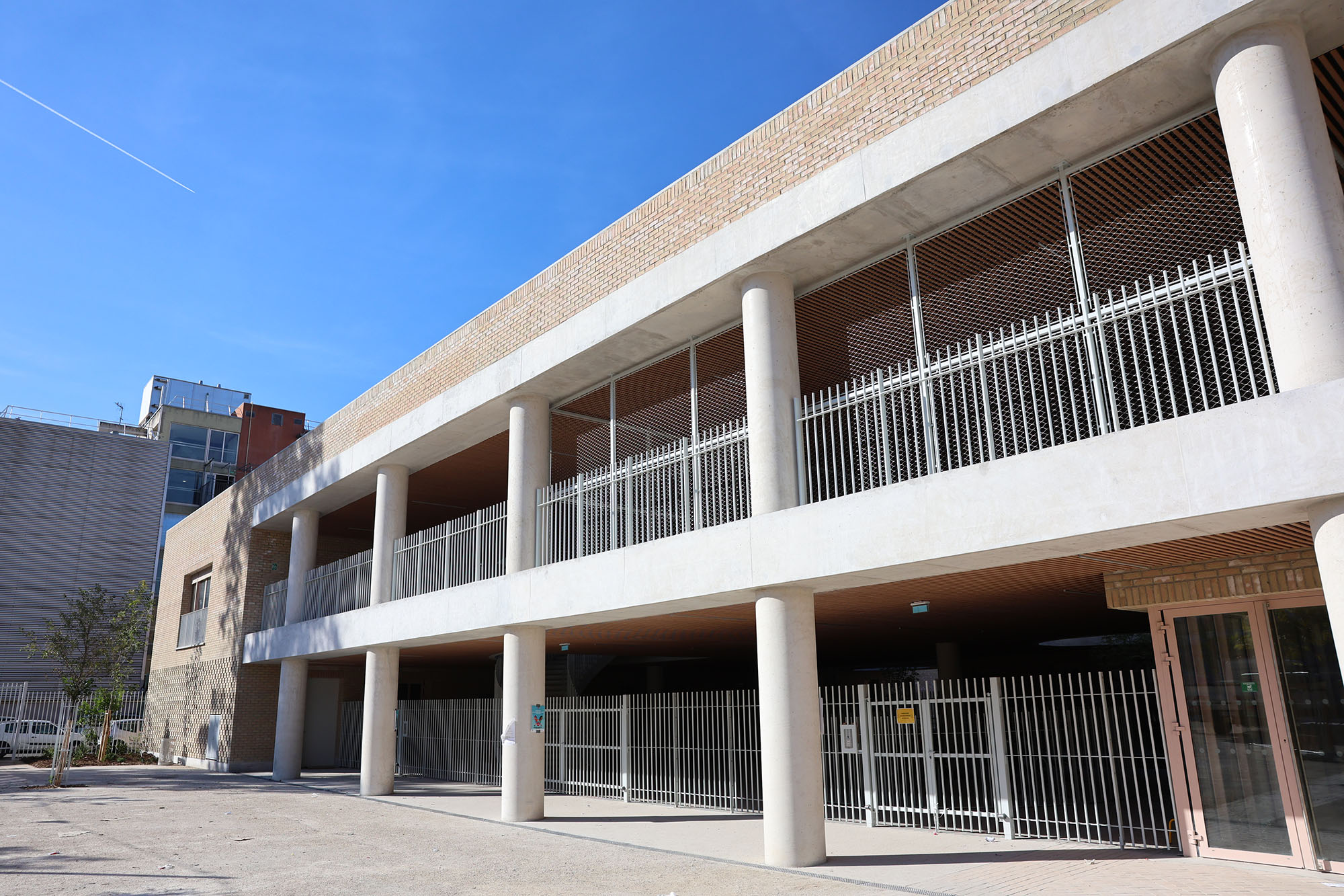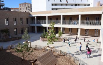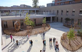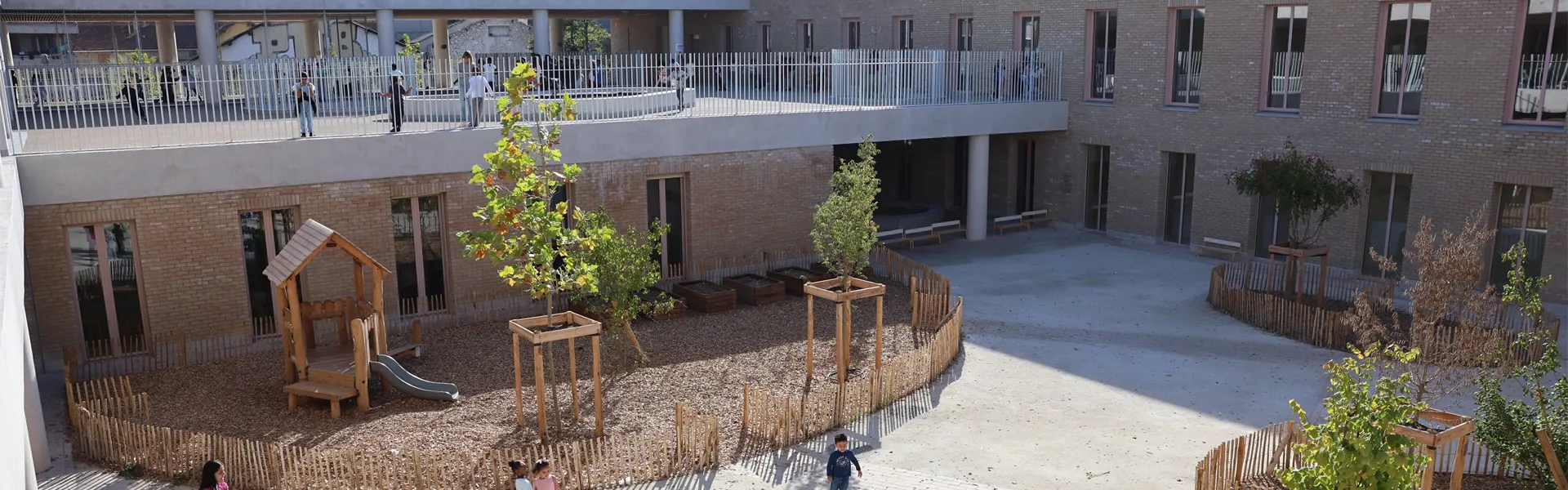 - se compose d'une école élémentaire et d'une école maternelle, qui s’articulent autour de deux cours de récréation centrales, superposées sur deux niveaux et protégées par des façades en brique.
