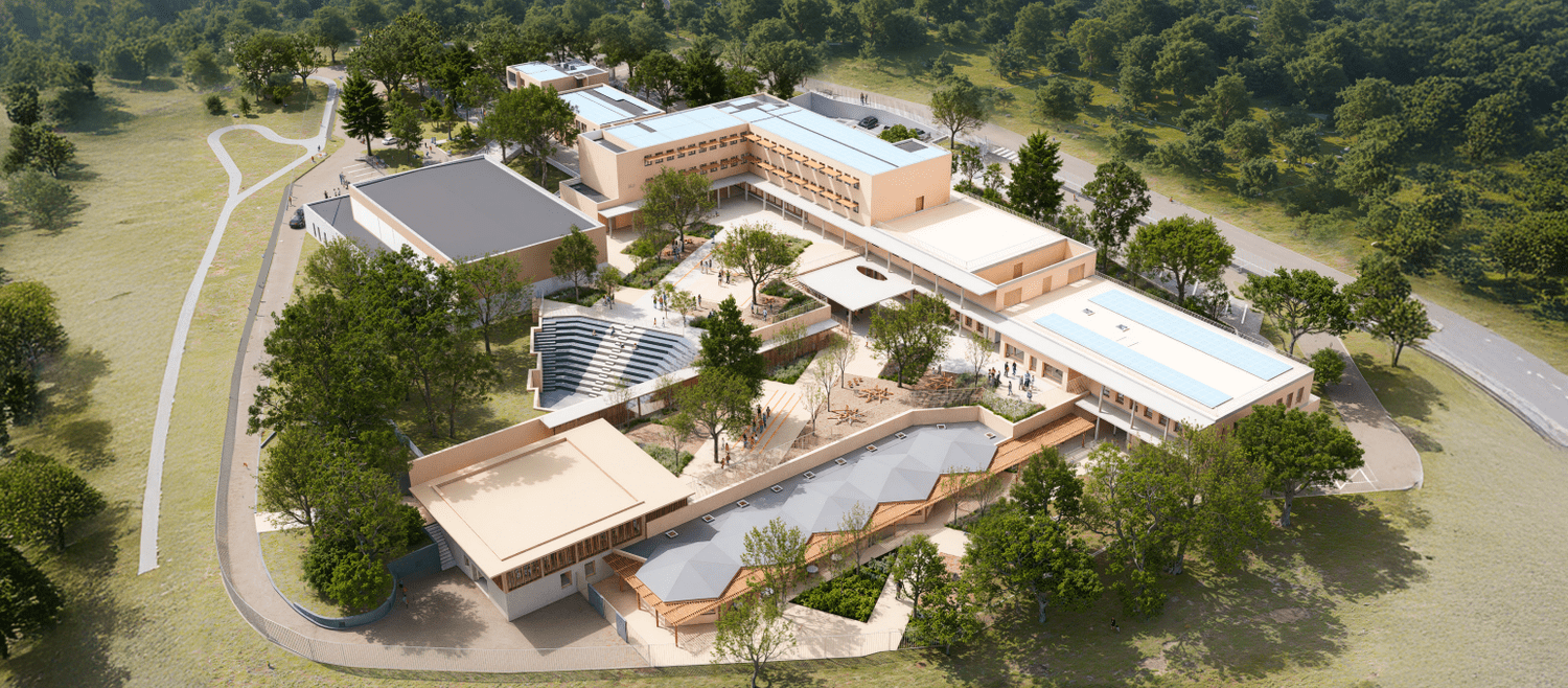 - des espaces communs, dont un parvis commun, un dépose minute, une salle polyvalente, des salles de restauration et un gymnase.