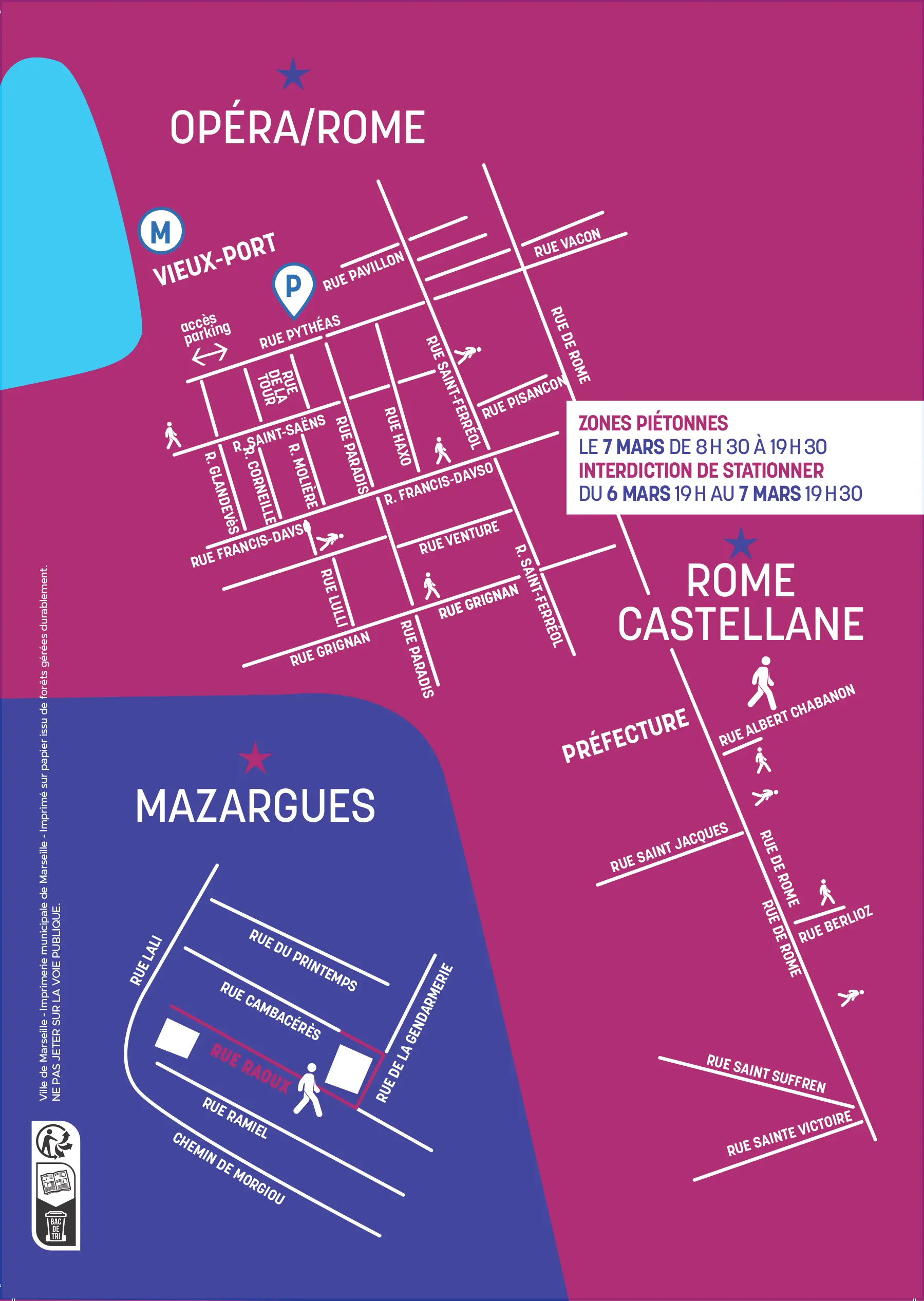 - La ligne de tramway T3 circulera de La Gaye à la Place Castellane, et les parkings du centre-ville restent ouverts et accessibles : le parking Charles de Gaulle sera accessible par la rue Pythéas depuis le Vieux Port, et le parking de l’Opéra par la rue Breteuil.
