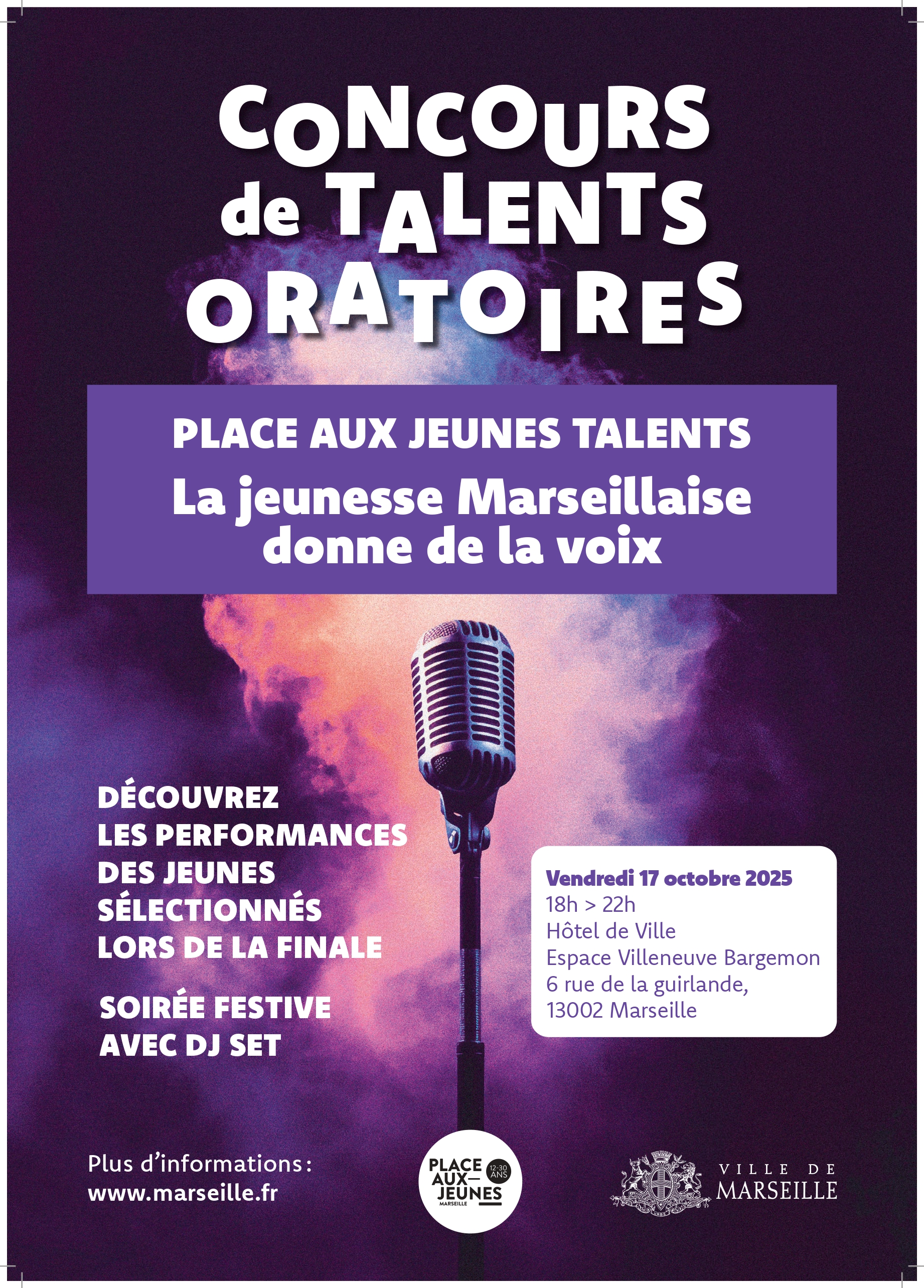 La Ville de Marseille souhaite valoriser la grande créativité des jeunes Marseillaises et Marseillais et lance la première édition du concours de jeunes talents oratoires, avec l’ambition de renouveler l’évènement. Ce concours a pour vocation de mettre en lumière la créativité, l’engagement et la parole des jeunes Marseillaises et Marseillais âgés de 12 à 30 ans.