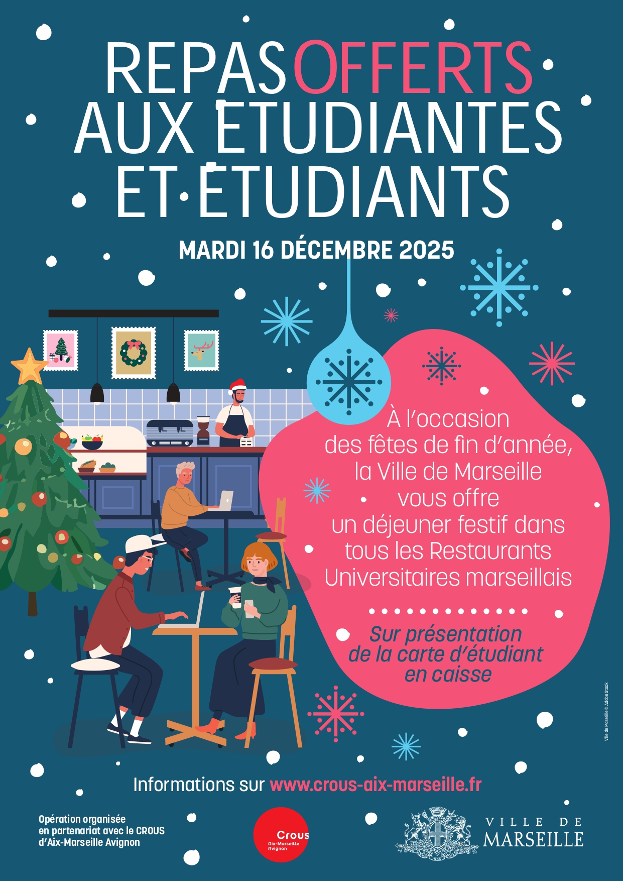 À l’occasion des fêtes de fin d’année, la Ville de Marseille offre un déjeuner festif aux étudiants le mardi 16 décembre, dans les Restaurants Universitaires.