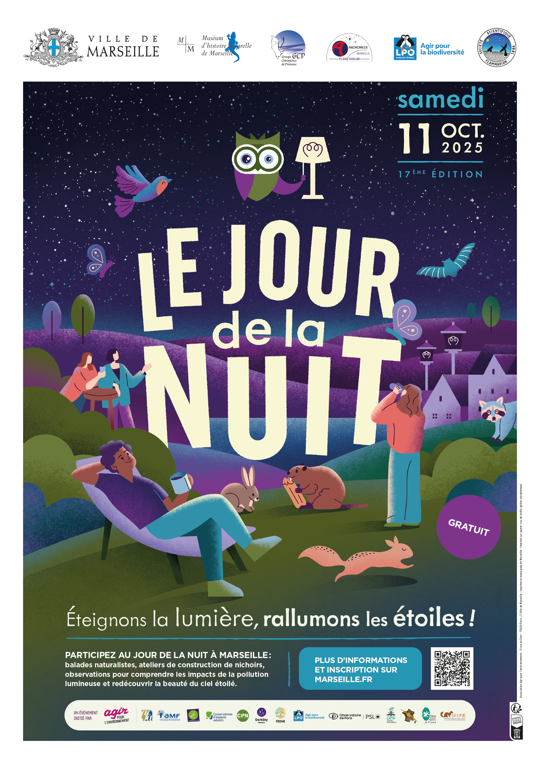 Ouverte à toutes et tous, "Le Jour de la Nuit' est une grande manifestation nationale de sensibilisation à la pollution lumineuse, à la protection de la biodiversité nocturne et à la beauté du ciel étoilé, organisée par l’association Agir pour l’Environnement et relayée sur son territoire par la Ville de Marseille.