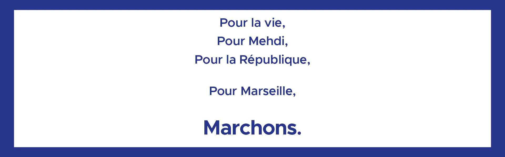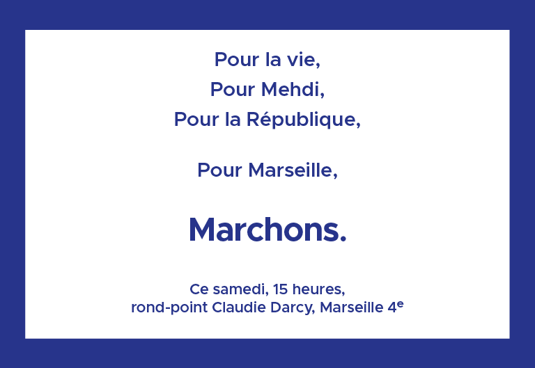 Vignette Catégorie principale Icone ILLUSTRATOR_ICONS_MAIRIE Nom Mairie Couleur #2c62cb Marchons. Dernière mise à jour : Vendredi 21 novembre 2025 Pour la vie, Pour Medhi, Pour la République, Pour Marseille, Marchons. Ce samedi, 15 heures,rond-point Claude Darcy, Marseille 4e
