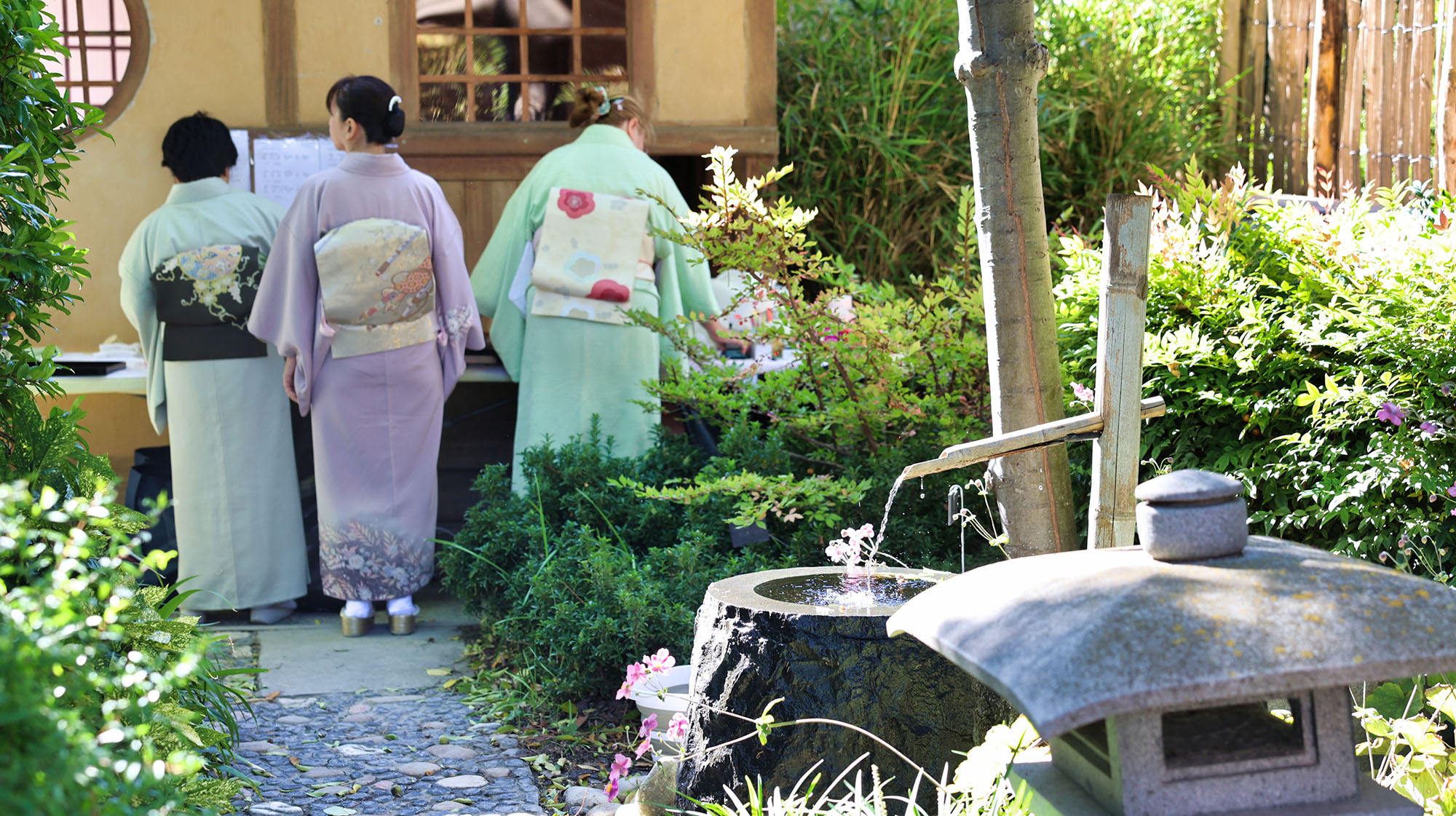 - le “chemin de rosée”, agrémenté de lanternes, permettait aux maîtres de cérémonies du thé dʼaccéder au pavillon.