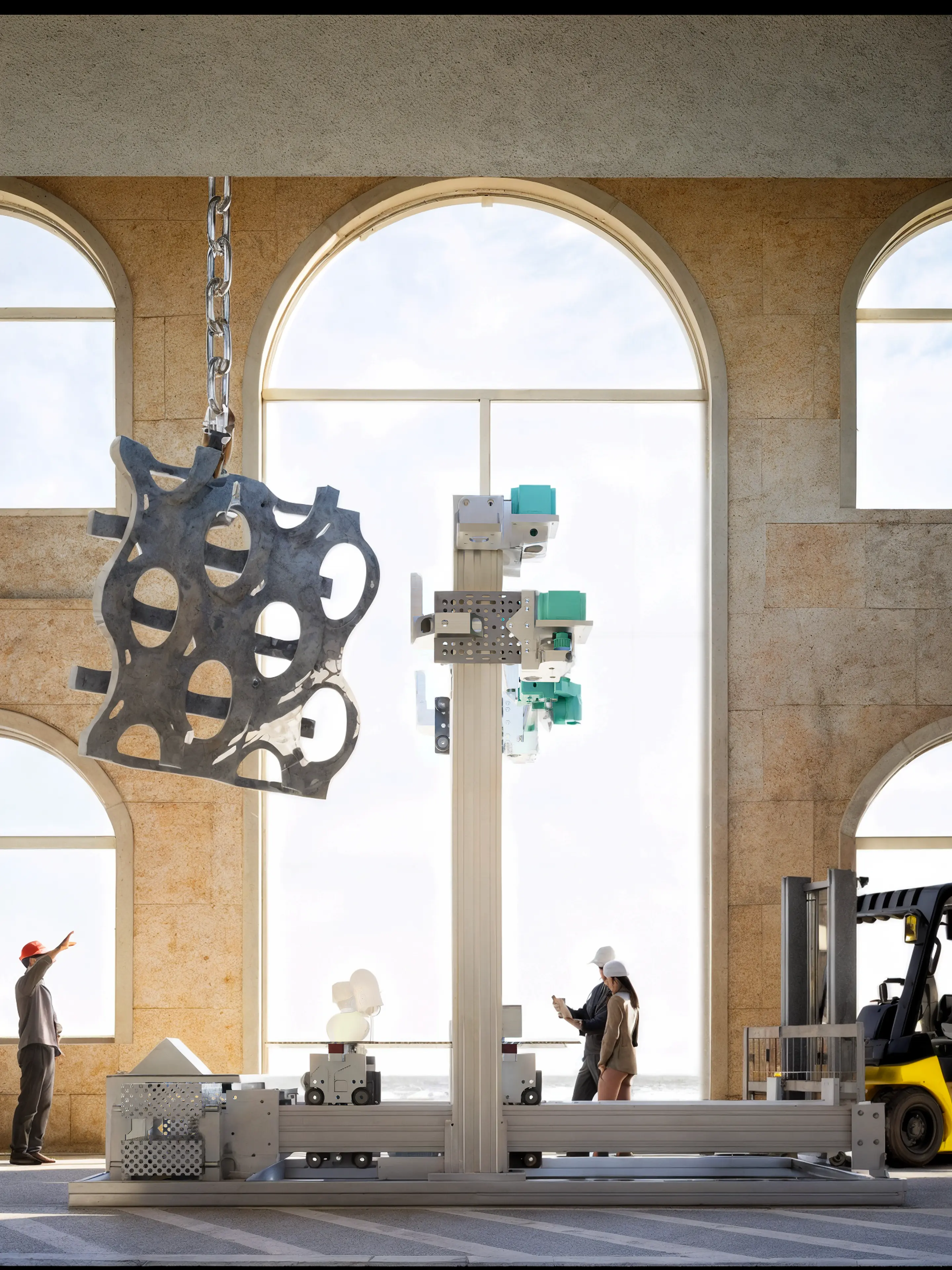 Des éoliennes installées sur la toiture assurent une autonomie énergétique, tandis que l’usage de matériaux recyclés et de procédés de fabrication additive renforce la cohérence écologique du lieu.