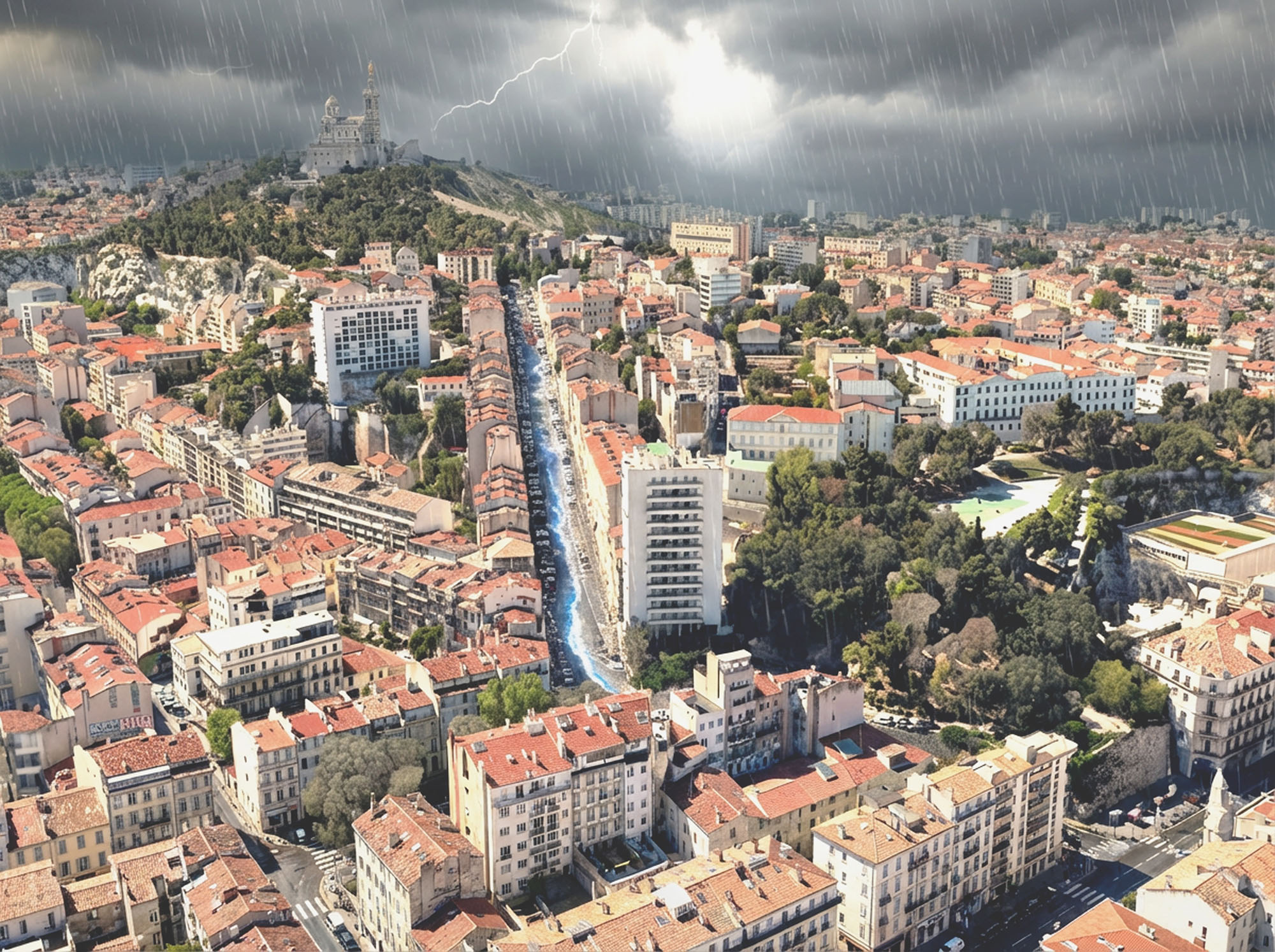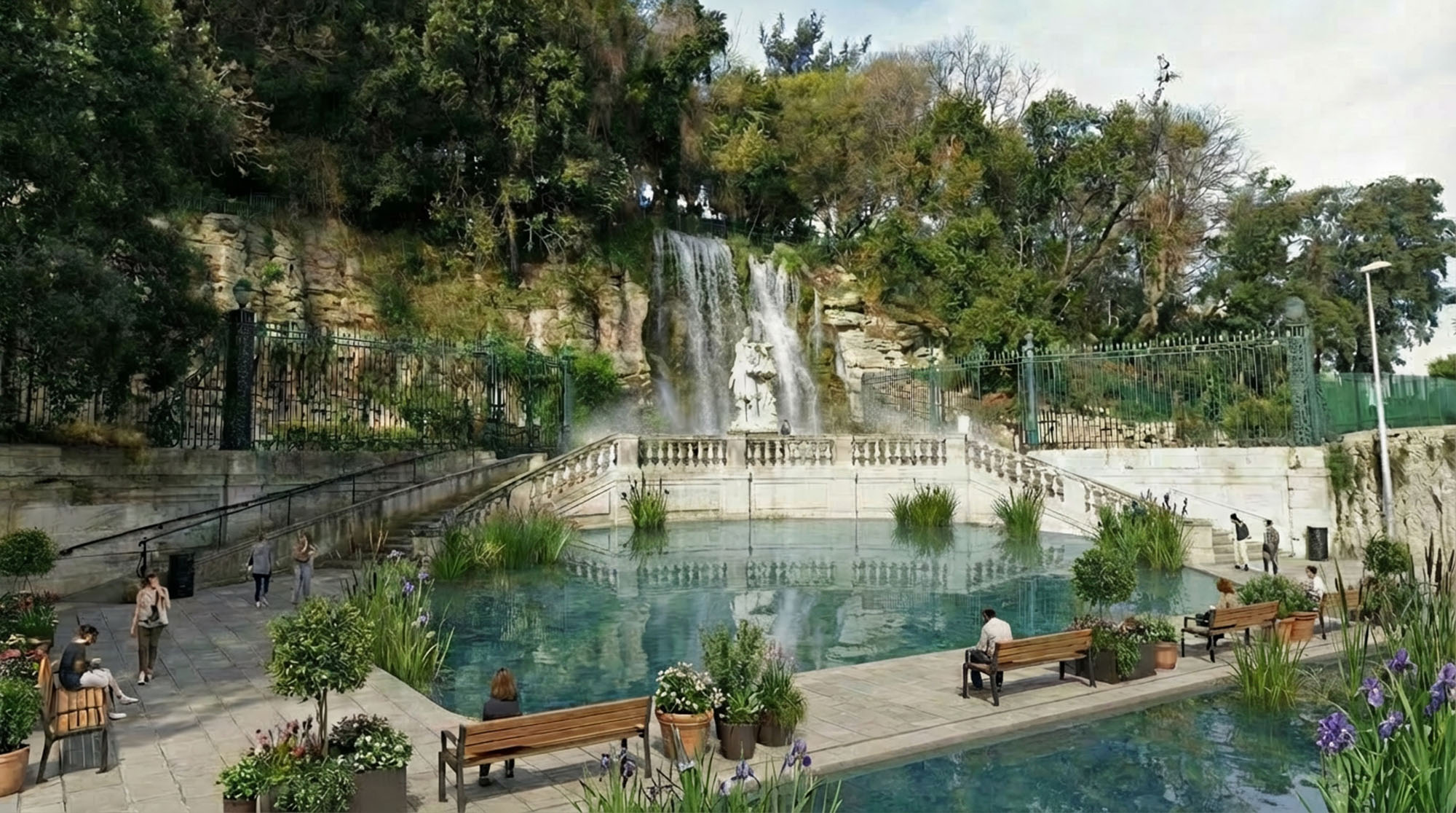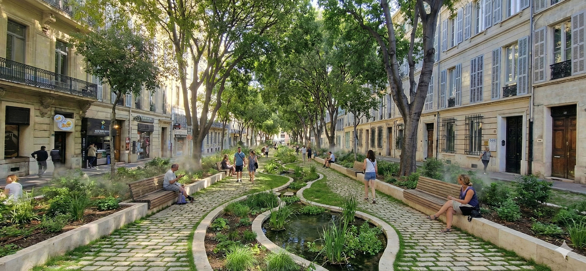 En 2053, le Cours Pierre Puget est devenu une évidence. Chaque jour, on y marche à l’ombre, porté par la fraîcheur de l’eau qui descend lentement depuis la colline. Jadis rue dominée par la voiture, il est aujourd’hui une traversée piétonne, nourricière et protectrice. La pluie n’y est plus une menace : elle est captée, ralentie, filtrée, stockée, puis partagée. Les noues paysagères nettoient l’eau et alimentent des cultures de proximité, gérées collectivement par les habitants. En contrebas, la place-impluvium accueille les eaux intenses sans urgence et rafraîchit les bâtiments alentour. En reliant la colline, la ville et le port, le Cours Puget incarne une résilience discrète, quotidienne, profondément marseillaise : partager l’eau, c’est partager la ville.