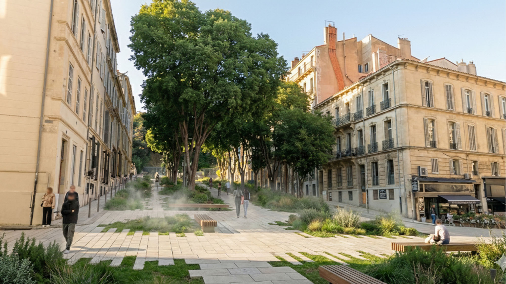 En bas, près du Palais de Justice, le regard s’ouvre discrètement vers le port. On comprend alors le sens du Cours : relier la colline, la ville et la mer. Retenir l’eau en amont pour protéger le Vieux-Port, comme les Grecs, venus de Phocée en 600 avant J.C., fondateurs de Massalia l’avaient intuitivement compris. Révéler les pierres anciennes, les alignements, l’héritage de Pierre Puget, sans les figer.