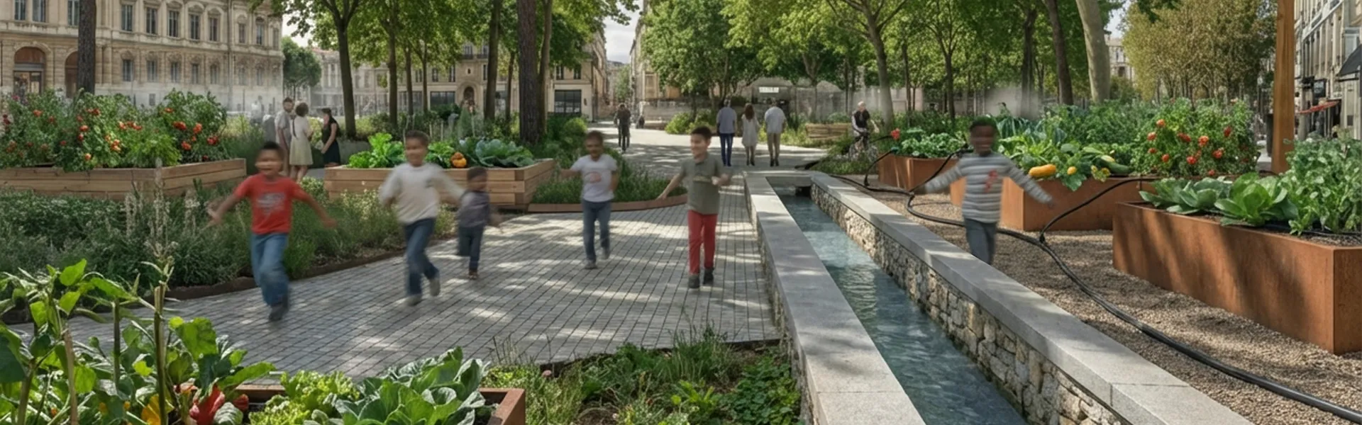 Les noues paysagères longent la promenade. Elles collectent l’eau de pluie, la filtrent par les sols et les plantes, la rendent à la terre. Autour d’elles, des parcelles cultivées dessinent une autre manière de vivre la ville : aromatiques, légumes, fruitiers bas. Ici, chacun sait que rien n’appartient vraiment à quelqu’un.