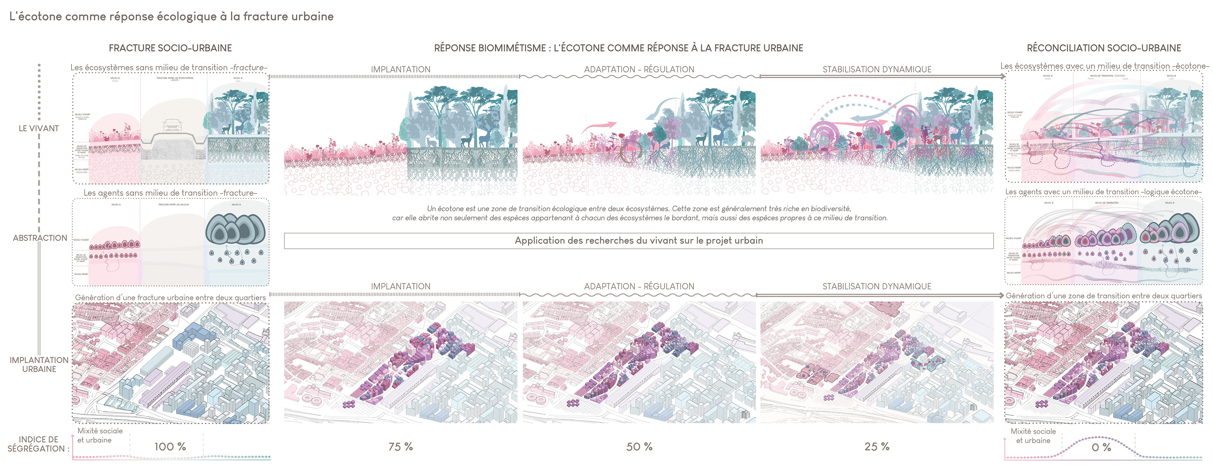À Marseille, les inégalités socio-spatiales se sont constituées au fil du temps, rendant aujourd’hui la fracture urbaine particulièrement lisible. À l’interface entre le nouveau quartier d’Euro-Méditerranée et les quartiers nord, l’avenue du Cap Pinède constitue une limite marquée entre deux quartiers fragmentés. Le projet urbain proposé vise à transformer cet espace de rupture en un quartier de réconciliation urbaine et sociale, afin de lutter contre les inégalités socio-spatiales. Adoptant une approche biomimétique, le projet s’inspire du vivant, et plus particulièrement de l’écotone, une zone de transition riche et nécessaire entre deux écosystèmes. À partir d’une analyse approfondie de l’écotone, ses propriétés ont été extraites puis transposées au projet urbain, notamment dans la conception de la morphologie urbaine, la répartition des programmes et les tracés urbains. Cette démarche permet de générer une couture urbaine favorisant la mixité sociale.