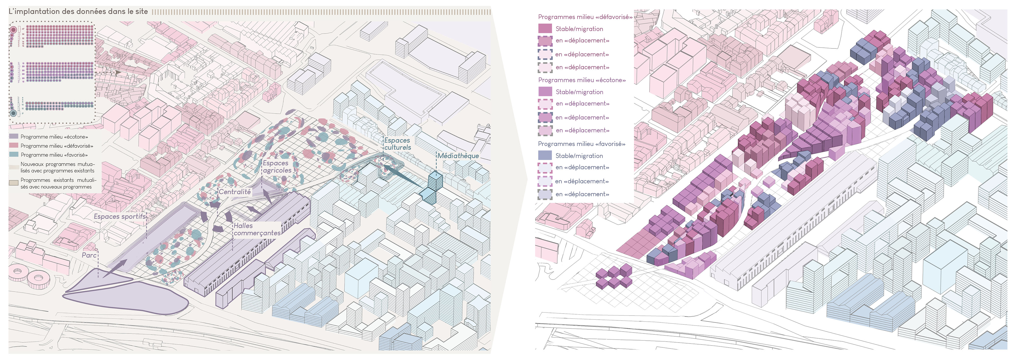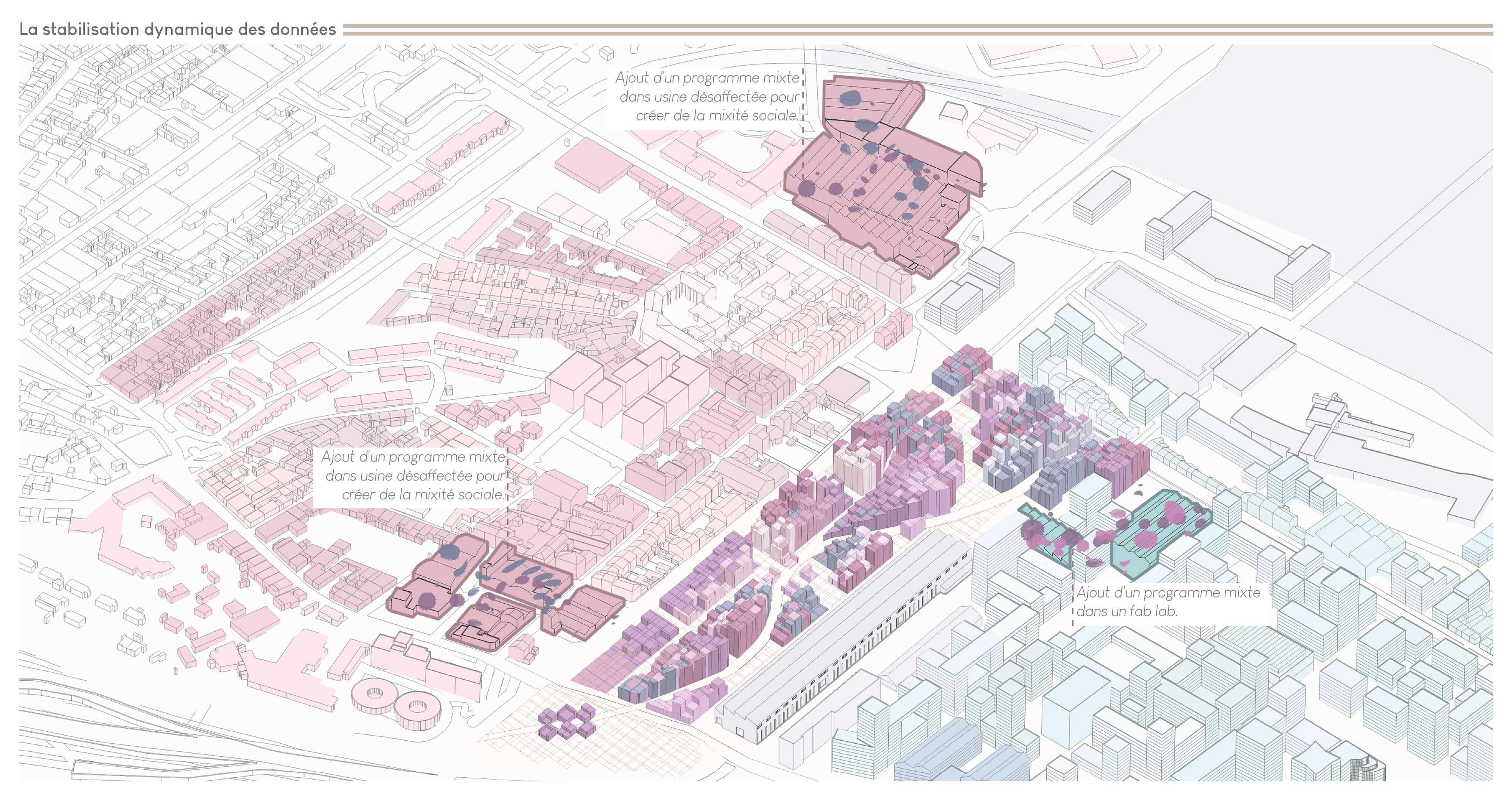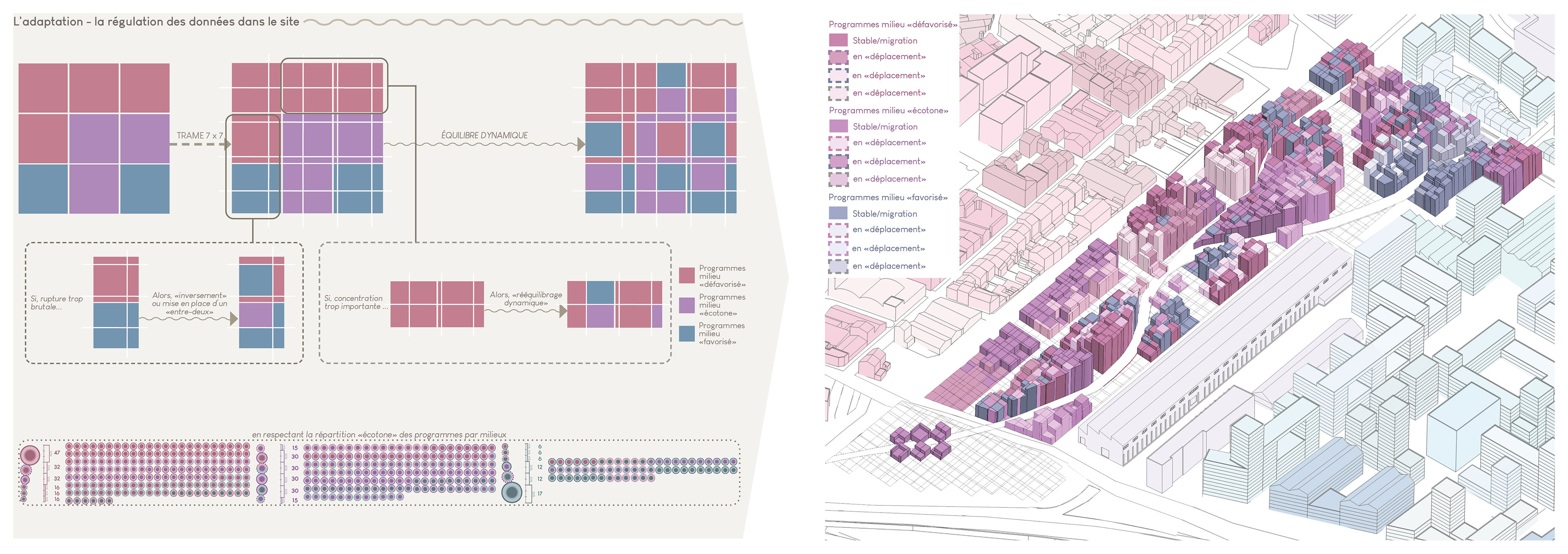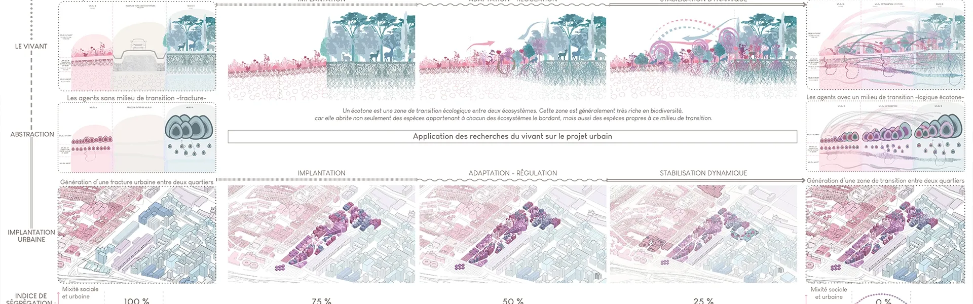 Le projet urbain s’appuie ainsi sur quatre données majeures : la répartition des programmes, les tracés urbains, les hauteurs bâties et la relation entre pleins et vides, constituant la morphologie urbaine. Ces paramètres sont organisés selon une logique inspirée des quatre grandes phases de formation de l’écotone : la répartition des données, leur implantation sur le site, leur adaptation et leur régulation, puis leur stabilisation dynamique. Cette méthode permet de générer une épaisseur urbaine évolutive, où les seuils remplacent les limites et où les usages se superposent.