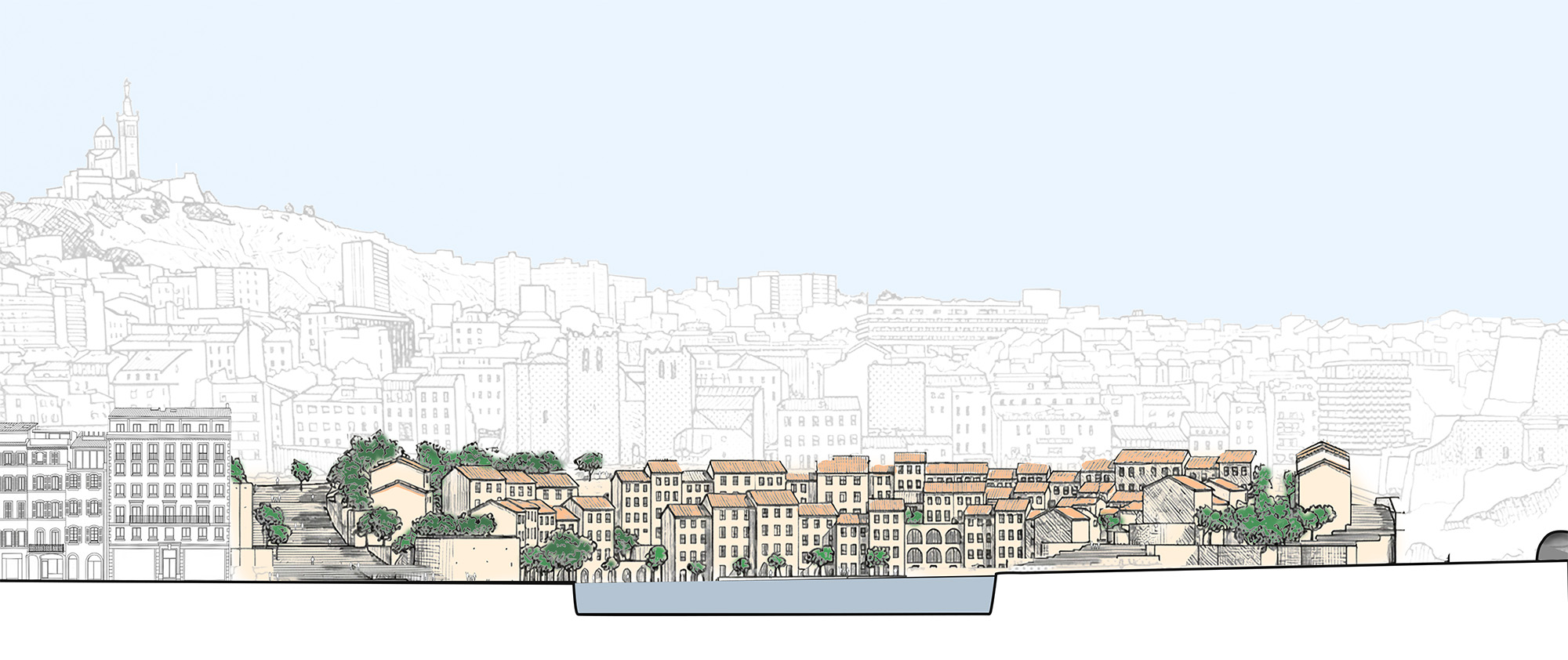 L’intervention repose sur une réinterprétation de la topographie originelle du site. En construisant au-dessus de l’infrastructure routière, le projet reconstitue symboliquement la colline disparue de la calanque du Lacydon et dessine un vallon habité, ouvert sur la mer. Les volumes bâtis, à l’échelle domestique et aux gabarits maîtrisés, s’inscrivent dans une morphologie marseillaise familière, composant un front urbain continu autour du bassin. L’infrastructure n’est pas dissimulée mais intégrée dans l’épaisseur de la ville, permettant de superposer le temps rapide des circulations métropolitaines et le temps lent des parcours piétons, de l’habitat et de l’espace public.