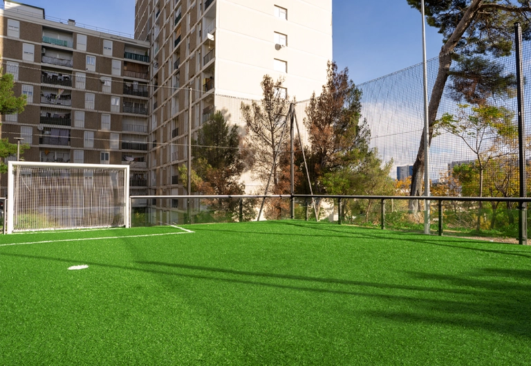 Les travaux ont entièrement transformé le City-Stade. Ils ont commencé par un important chantier de terrassement, de compactage et de reprise des sols avant la pose d’un gazon synthétique de haute qualité, doté d’un remplissage en noyaux d’olives respectueux de l’environnement. Le terrain a été agrandi pour offrir un espace de jeu plus confortable, passant de 23 × 12 mètres à 23 × 16 mètres.